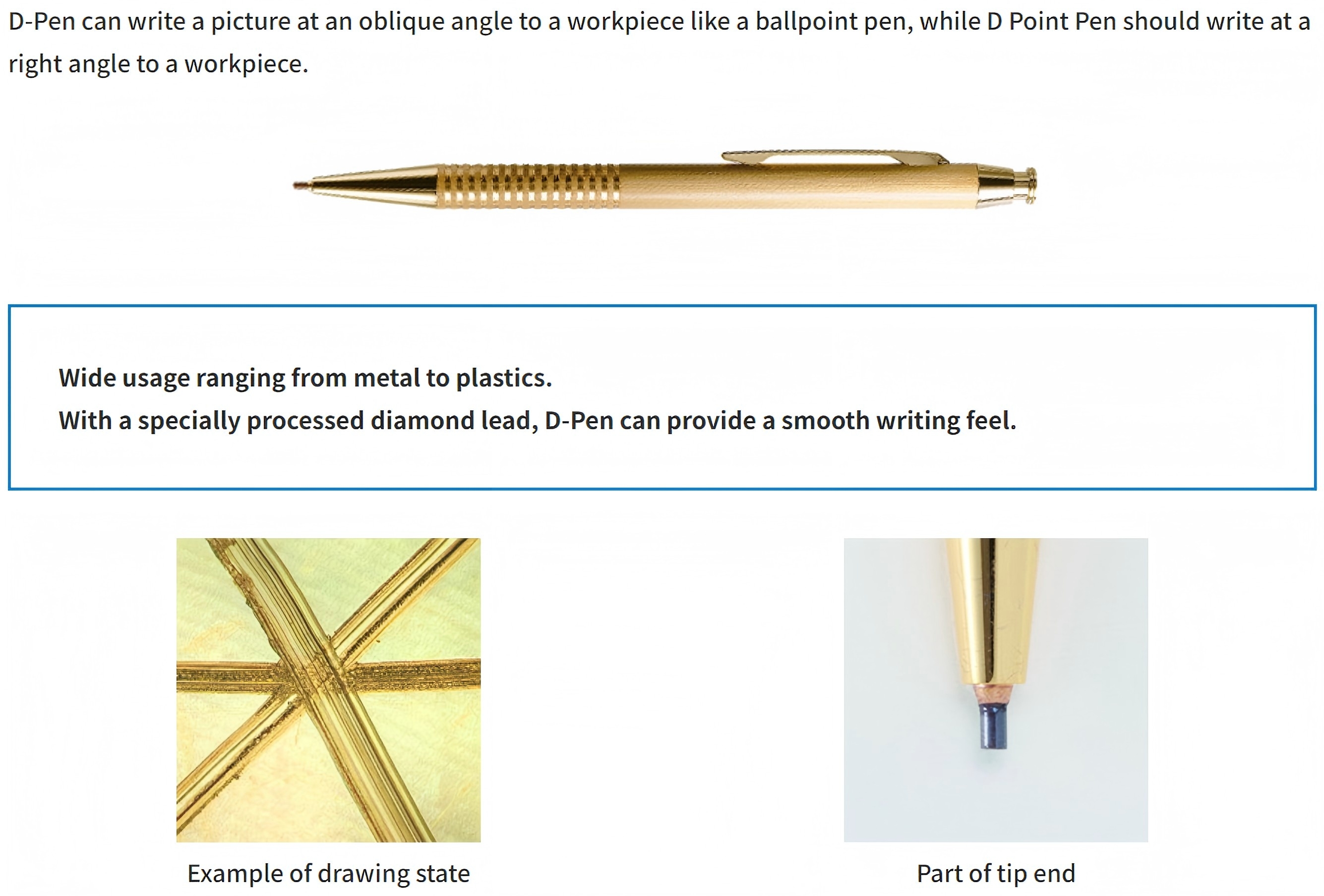 D-Pen uses a specially processed lead with diamond powder. By using the edge of its lead, you can write smoothly, so it can be used like a ballpoint pen to engrave or write on many materials such as glass and metal.