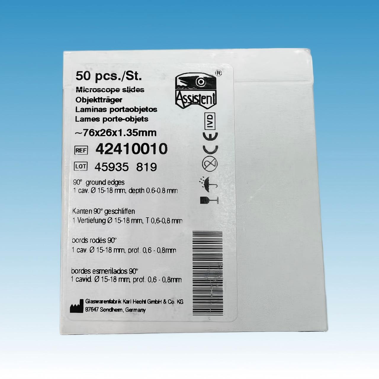 42410010 德国原装进口Assistent载玻片(单凹),76x26x1.35mm,凹槽圆形直径约15-18mm,深约0.6-0.8mm,50片/包
