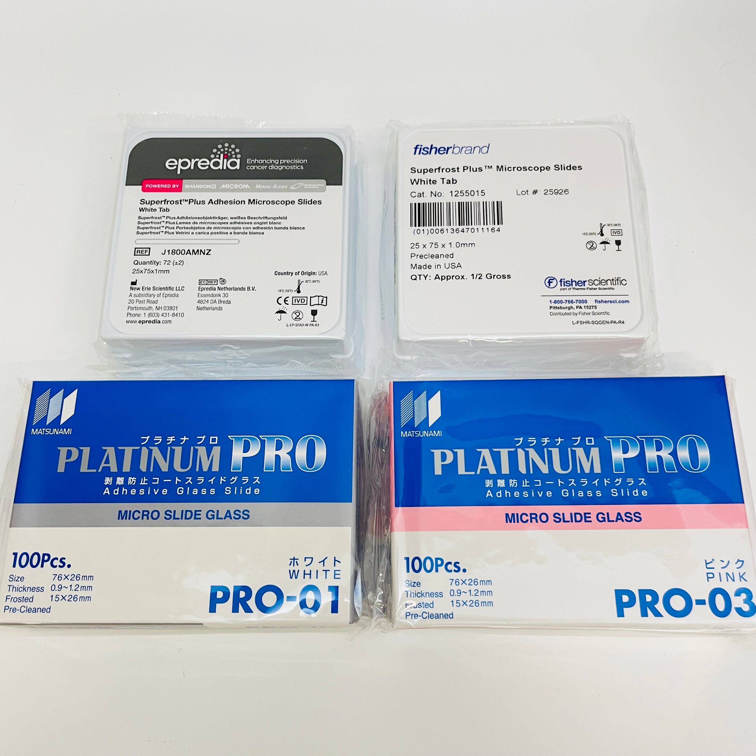 在免疫组化、原位杂交、细胞涂片、冰冻切片等实验中,为防止组织标本切片掉片,需要使用经过特殊处理的粘附载玻片,此类粘附载玻片主要分为正电荷Plus、多聚赖氨酸PLL、硅烷化APS,常用进口品牌为艾普迪Epredia Esco Erie、飞世尔Thermo Fisher Fisherbrand、松浪硝子Matsunami、徕卡Leica Surgipath、丹科Agilent DAKO、艾万拓(威达优尔)Avantor VWR、Sigma Aldrich、保瑞美Premiere等。