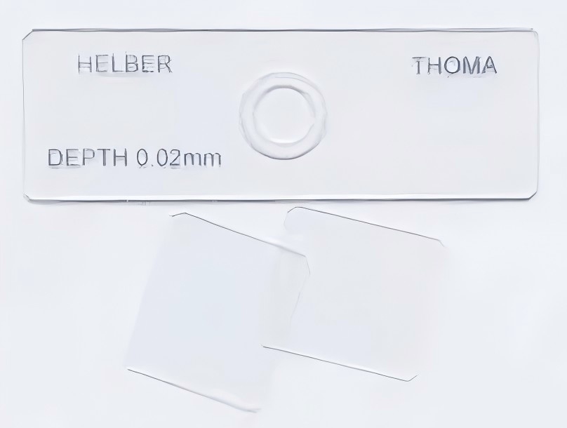 Helber counting chamber with 0.02mm deep, circular cell and Thoma ruling. Slide thickness: 1mm. With 2 cover glasses.