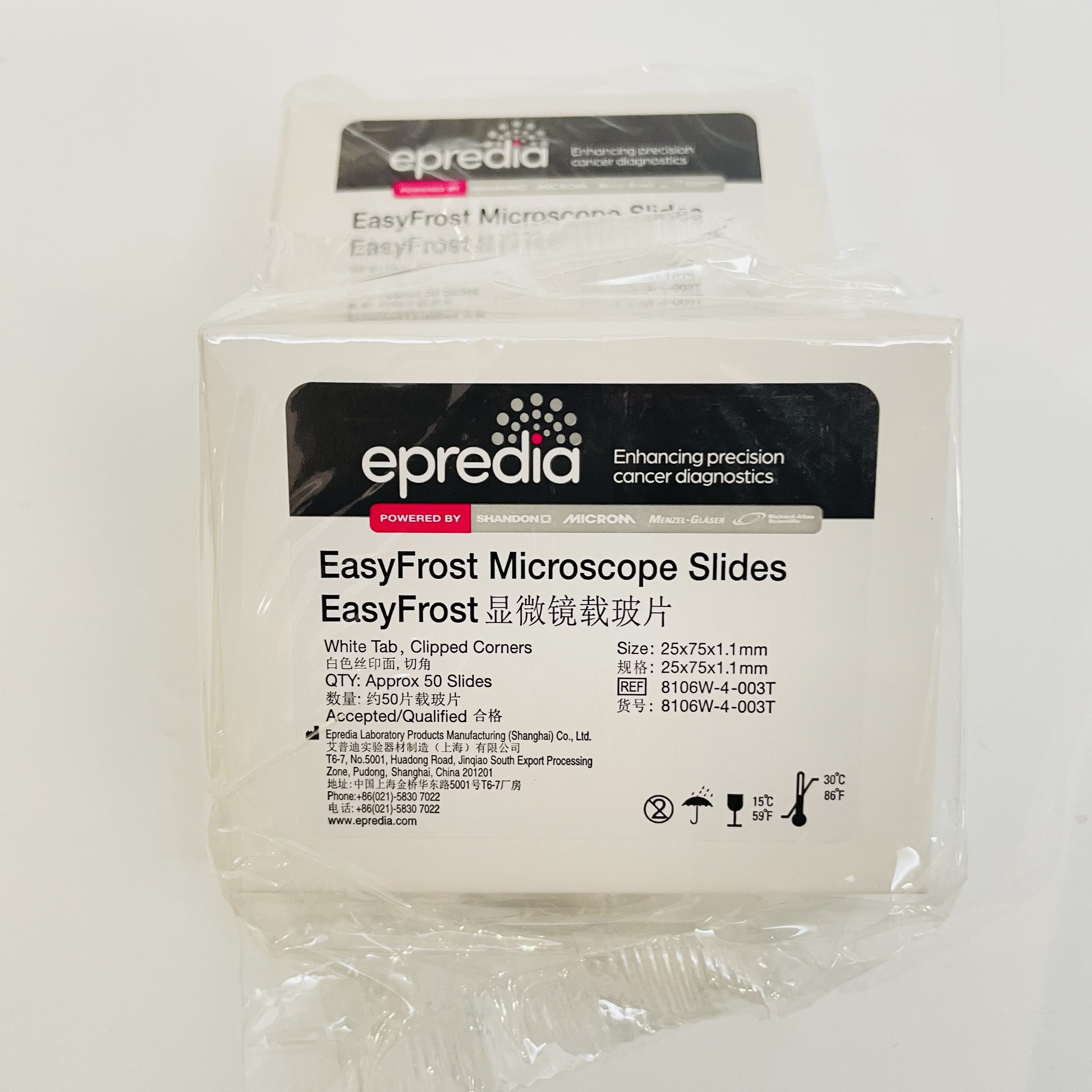 8106W-4-003T | EasyFrost白色丝印载玻片8106W-4-003T, 绿玻材质, 45度切角, 磨边, 25x75x1.1mm | 50片/盒, 40盒/箱 | 中国 |
